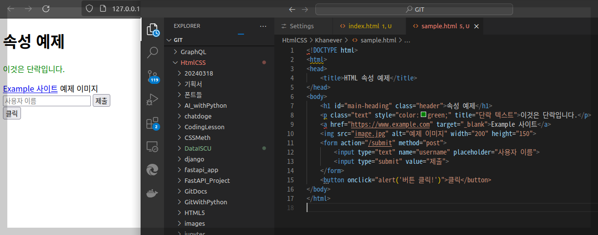 아래는 여러 속성을 사용한 예제 HTML 코드입니다.