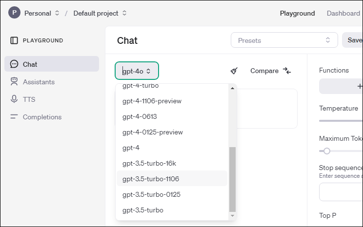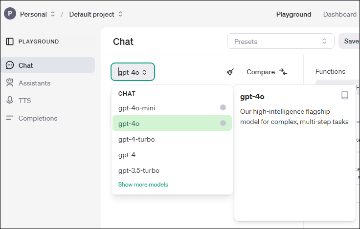 OpenAI 플레이그라운드의 모델 선택 창입니다. 이 창을 통해 다양한 GPT 모델 중에서 선택할 수 있습니다. 각 모델은 특정 작업에 적합하게 설계되었으며, 다음과 같은 몇 가지 주요 모델에 대해 설명드리겠습니다.