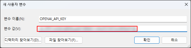 OPENAI_API_KEY와 같이 설정하려는 변수의 이름을 입력합니다. - 변수 값: 실제 API 키를 변수 값으로 입력합니다.
