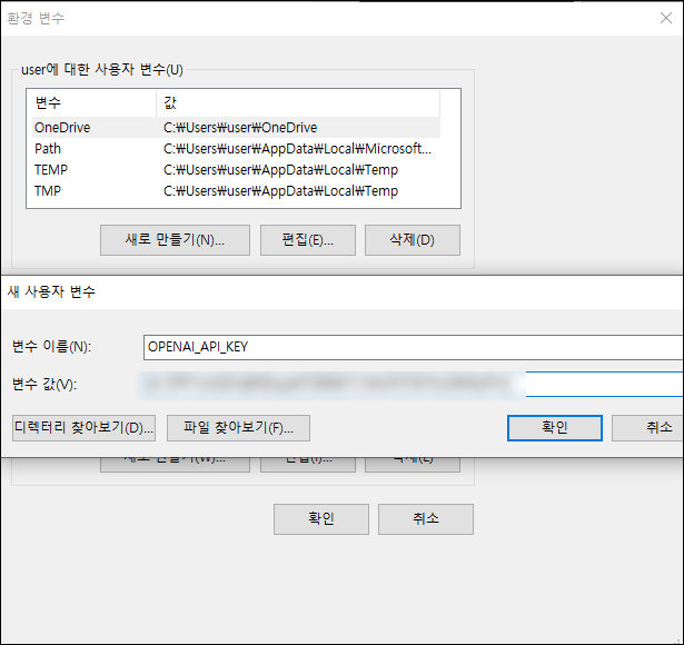 - 환경 변수 설정: Windows 10에서 API 키를 환경 변수로 설정합니다. 이는 API 키를 코드에 직접 넣지 않고 안전하게 사용할 수 있는 방법입니다. 시스템 속성에서 '환경 변수'를 선택하고, 새로운 사용자 변수를 추가합니다. 변수 이름을