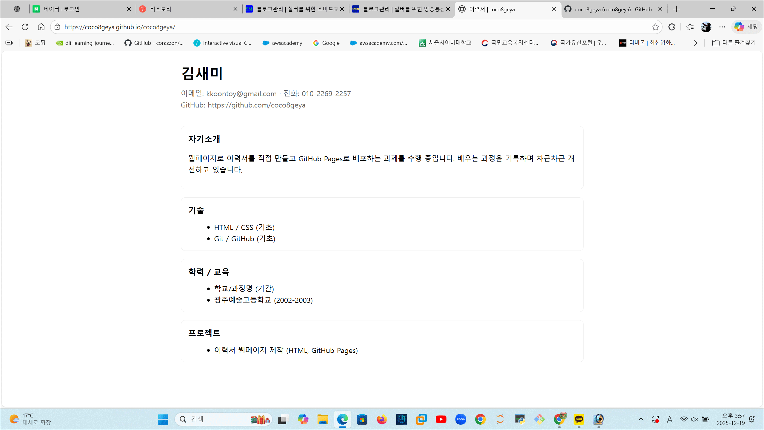 이력서 웹페이지를 만든 저장소의 README에는 다음이 담깁니다.