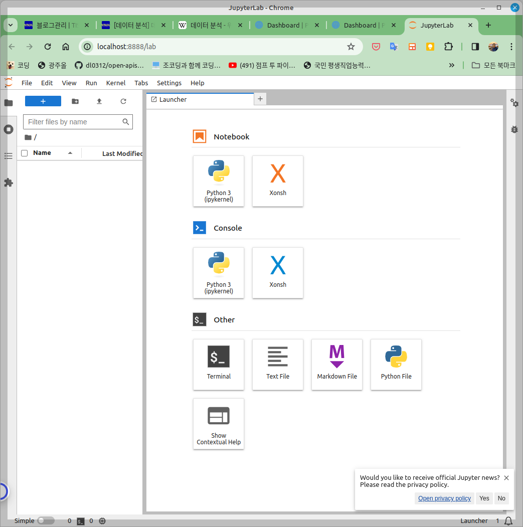 화면 하단에는 Jupyter 뉴스를 받고자 하는지 묻는 메시지가 있으며, 'Yes' 또는 'No'를 선택하여 응답할 수 있습니다. 화면 오른쪽 상단에는 설정, 탐색 창을 숨기기, JupyterLab의 다양한 뷰를 제공하는 아이콘이 있습니다.