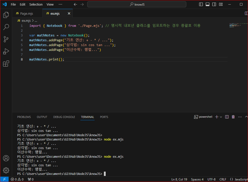 여기서 export default Page;는 Page 클래스가 해당 모듈의 기본 내보내기임을 의미합니다. 따라서 Page 클래스는 다른 모듈에서 중괄호 없이 가져올 수 있습니다. 반면에 export { Notebook };는 Notebook 클래스를 명시적으로 내보내는 것이므로, 중괄호를 사용하여 해당 이름으로 가져와야 합니다.
